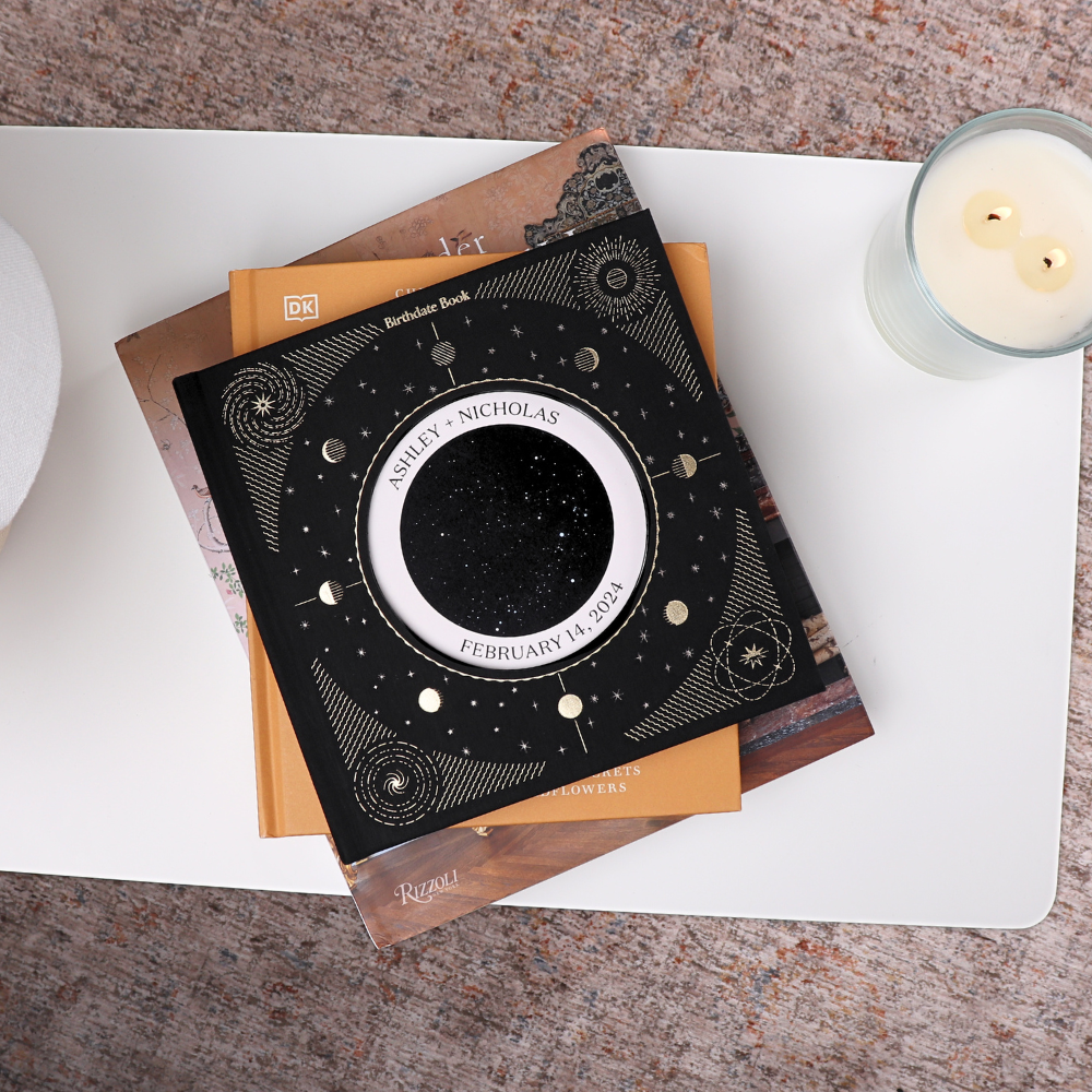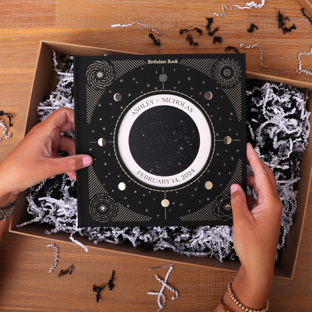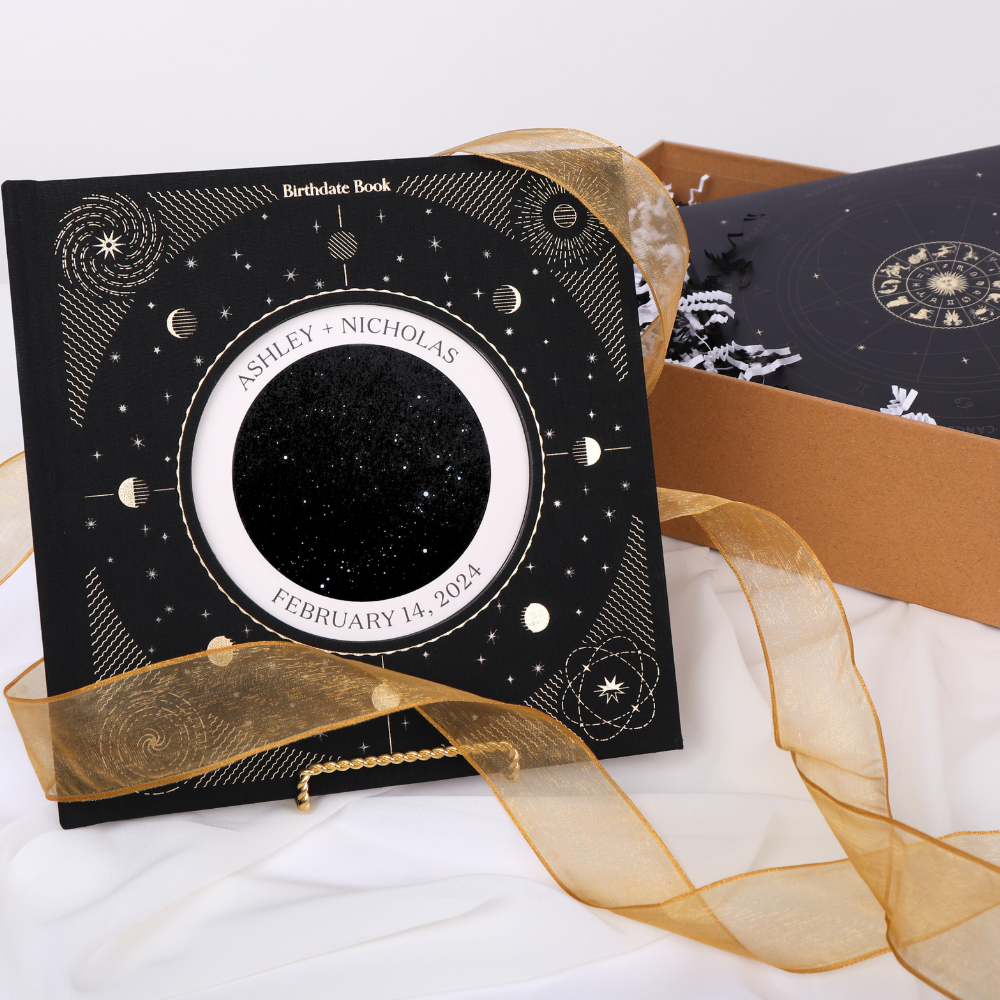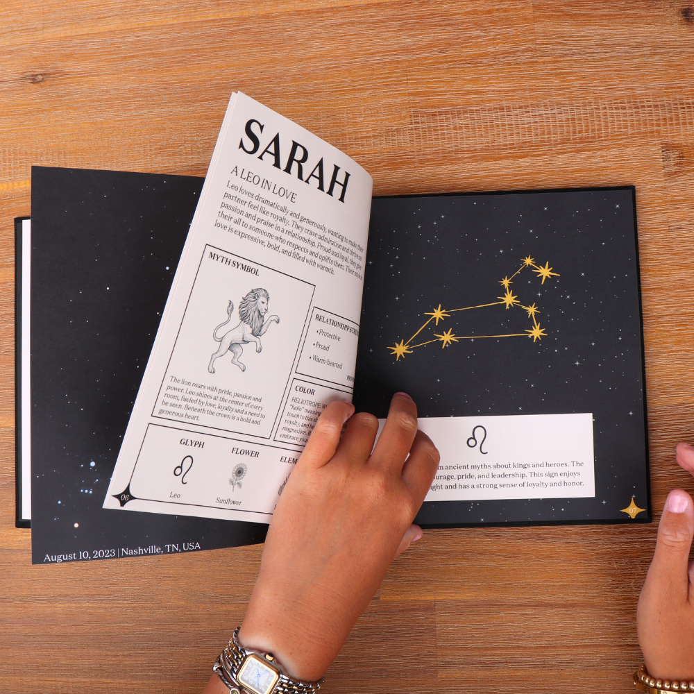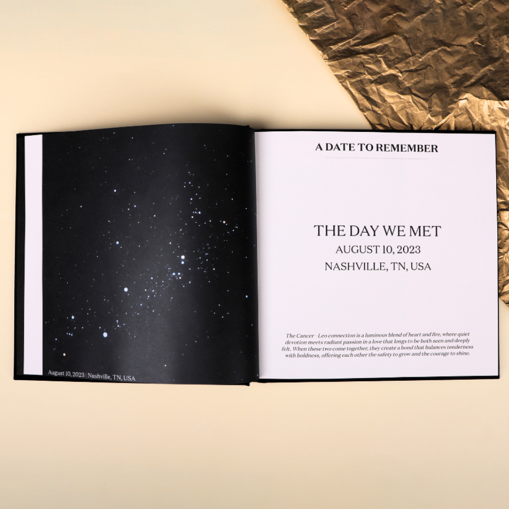 A made-to-order book that explores the astrology behind your relationship. 10 personalized chapters, evaluating your compatibility across key relationship dynamics, plus a closer look into each partner’s personality in love. Each book includes a beautiful fabric-bound hardcover, featuring an image of the night sky on a meaningful date in your relationship.